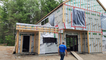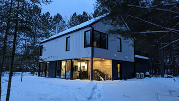 Conception d'une résidence de style scandinave / contemporaine en Estrie. Le but était de favoriser la relation entre les espaces intérieurs ouverts et l'environnement extérieur. Érigée sur une dalle cette maison est à même le sol. La fenestration au sud permet de laisser passer les rayons de soleil en hiver et de réchauffer la pièce de manière passive.
